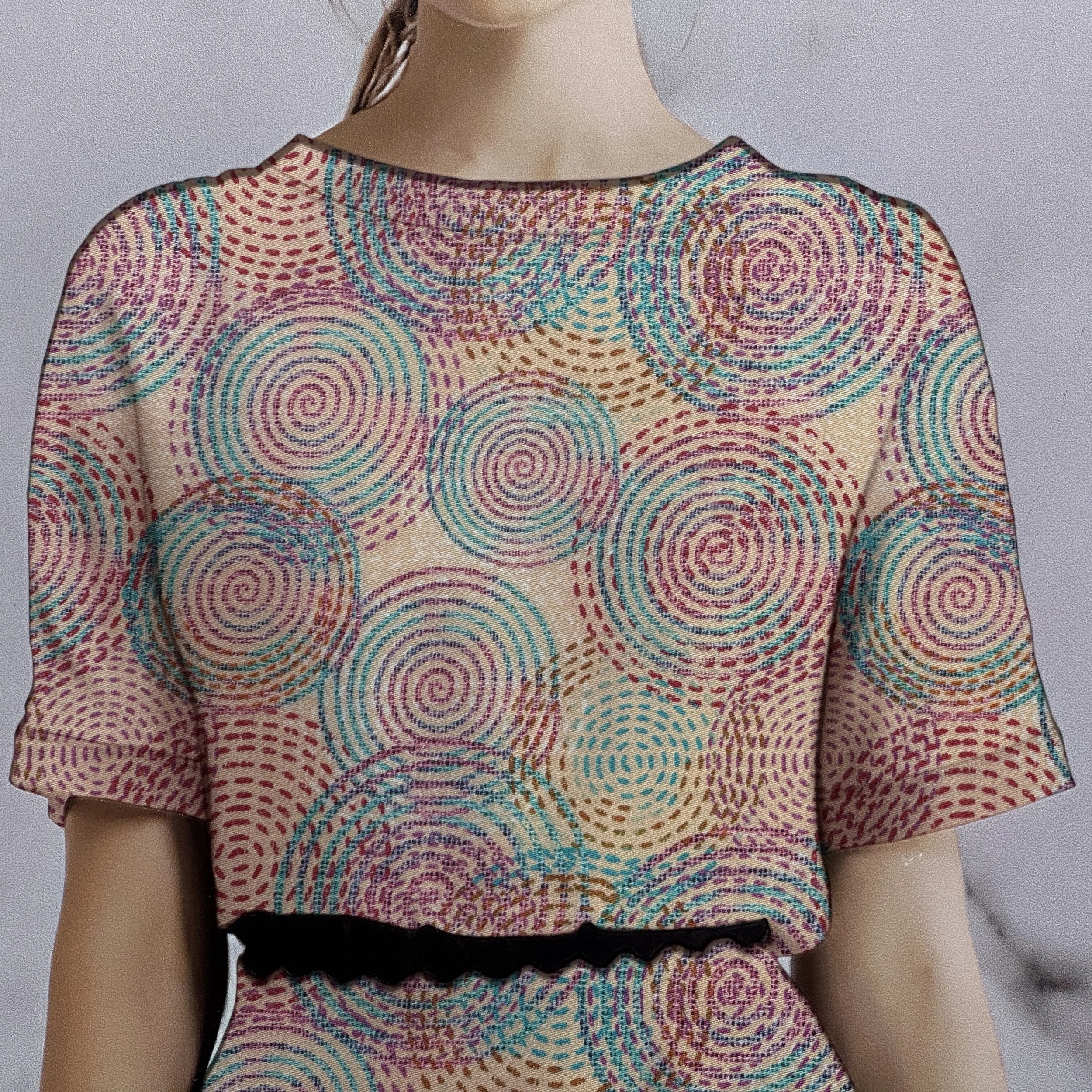 Purchase beautiful viscose fabric adorned with bright geometric shapes-diamonds and triangles—arranged in a balanced, symmetrical pattern.